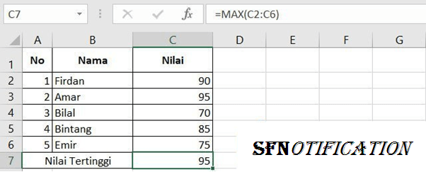 Fungsi Max di Microsoft Excel digunakan untuk mencari nilai tertinggi dari range tertentu. Bentuk penulisannya adalah =Max(cell awal : cell akhir). Masih menggunakan tabel yang sama, kita akan mencoba mencari nilai tertinggi dari range nilai, maka rumusnya adalah =MAX(C2:C6). Contohnya seperti pada gambar dibawah ini :