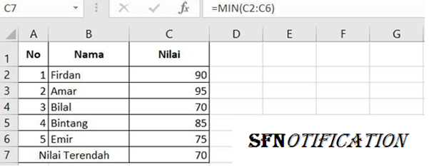 Fungsi Min di Microsoft Excel digunakan untuk mencari nilai terendah dari range tertentu. Bentuk penulisannya adalah =Min(cell awal : cell akhir). Masih menggunakan tabel yang sama, kita akan mencoba mencari nilai terendah dari range nilai, maka rumusnya adalah =Min(C2:C6). Contohnya seperti pada gambar dibawah ini :
