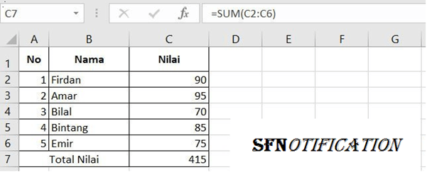 Fungsi Sum digunakan untuk menjumlahkan isi data yang ada pada range tertentu. Bentuk penulisan untuk Fungsi Sum di Microsoft excel adalah =SUM(cell awal : cell akhir). Contohnya kita memiliki tabel nilai siswa seperti dibawah ini, dan kita ingin mengetahui berapa total nilai yang dimiliki dari semua siswa tersebut, maka penulisan rumusnya adalah =SUM(C2:C6) seperti pada gambar berikut :